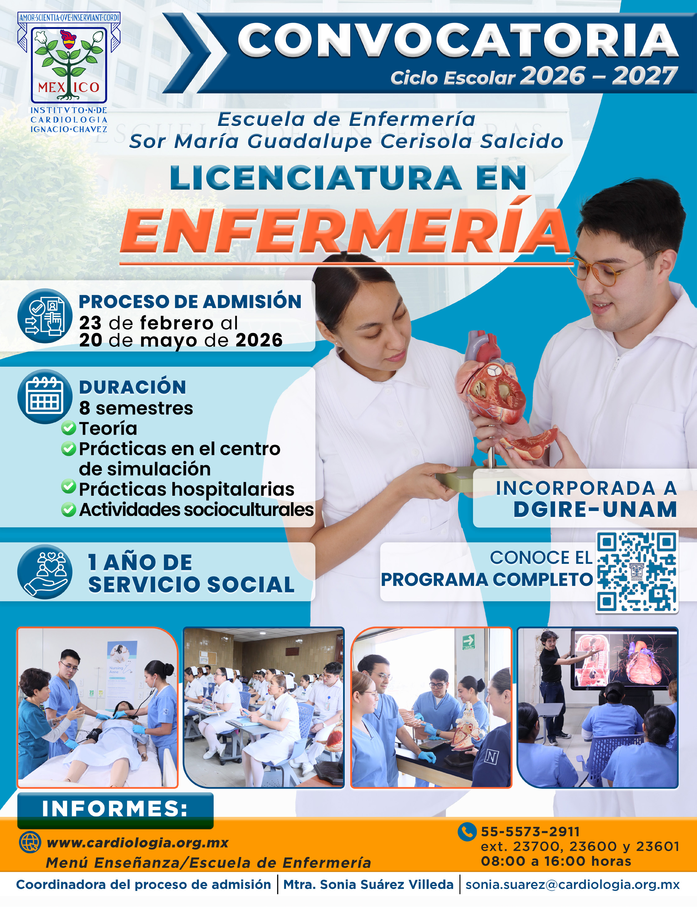 La Escuela de Enfermería del Instituto Nacional de Cardiología, es líder desde 1945 en la formación de recursos humanos de enfermería en el país, con reconocimiento nacional e internacional.